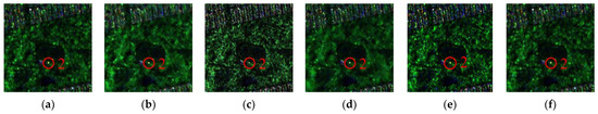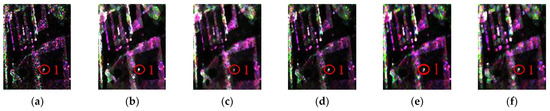 Figure 12a is the Pauli decomposition result of the SLC data. Figure 12b–f shows that the five filters all have certain speckle removal capabilities. We still intercept region 1 in Figure 12 for analysis filtering details. The results are shown in Figure 13.