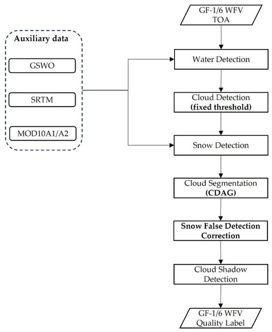 To meet the demand for producing the GF-1/6 WFV ARD quality marking data products, we should produce data products with similar accuracy to the Landsat series satellites and Sentinel-2 satellites. It should contain six categories: clouds, cloud shadows, snow, water bodies, land, and fill values. Figure 1 illustrates the GF-1/6 WFV ARD quality label algorithm’s processing flowchart.