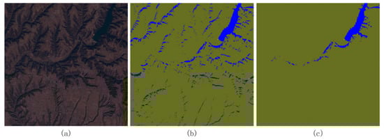 Presents an example of the algorithm’s water body correction [Green: the land surface; Blue: water bodies]: (a) Partial GF-1 image with a pixel size of 512 × 512. (b) Conceptual diagram illustrating the outcomes of water detection using thresholding, which erroneously identifies some mountainous areas as water bodies. (c) Conceptual diagram showcasing the corrected results achieved by incorporating GSWO and SRTM data, effectively eliminating the misidentified mountainous regions.