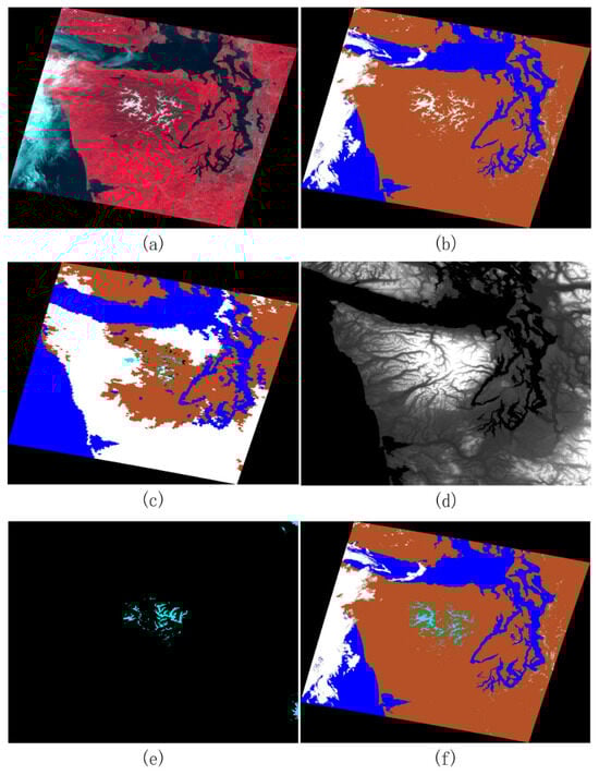 GF-1/6 Quality Labeling Process Data Example (Olympic Peninsula, Mount Olympus). [Brown: the land surface; Blue: water bodies; Cyan: snow; White: clouds] (a) depicts the original image; (b) showcases the image where cloud detection errors occur; (c) displays MOD10A1 data with a spatial resolution of 500 m; (d) presents SRTM data with a spatial resolution of 90 m; (e) illustrates simulated snowy mountain conditions; (f) demonstrates the image after correcting the erroneously detected clouds as snow.