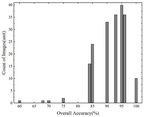 The overall accuracy, as depicted in Figure 10, was calculated based on 200 randomly selected regions (300 × 300 pixels) from a pool of 75 images, resulting in an average overall accuracy of 91.53%. The graph illustrates that over 77% of the tested images exhibit a high degree of overall accuracy. However, the utilization of low-resolution MODIS data and subsequent resampling do impact the overall accuracy of cloud detection, resulting in a slight decline. Furthermore, there are instances where certain test images yielded an overall accuracy below 80%. A detailed examination of these images revealed that the MOD10A2 data still encompasses a substantial proportion of snow-covered areas obstructed by clouds, thereby compromising the precision of snow mountain simulation. Nonetheless, several images achieved an overall accuracy surpassing 90%, underscoring the robust performance of our algorithm in effectively discerning between clouds and snow.
