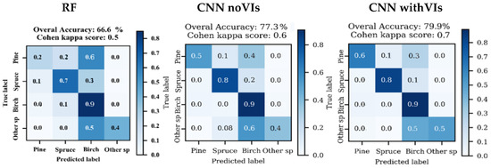 4.3. Comparing the Performances of CNN and RF in Seedling–Tree Species Classification