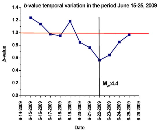 b-value variation shows how, on 19 June, the curve began to decrease, down to 0.85 on the 20, to 0.76 on the 21, and to its minimum value of 0.56 on 22 June, precisely the day on which the highest magnitude aftershock was recorded. This latter observation evidences how, by taking into account a specific time window, it could be possible to identify a precursor phenomenon taking place two days before the occurrence of the high-magnitude earthquake.