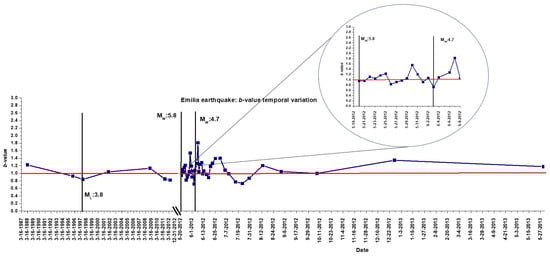 b-value was 1.22, then it began to decrease; it was 0.92 in the early months of 1996, and it reached a minimum of 0.84 in July 1997. These low values seem to indicate that a high magnitude earthquake had occurred in the proximity of the area, and it is interesting to note how in October 1996 a 5.4 Mw earthquake was recorded in Correggio (Reggio Emilia, 44°48′N latitude, 10°42′E longitude) [