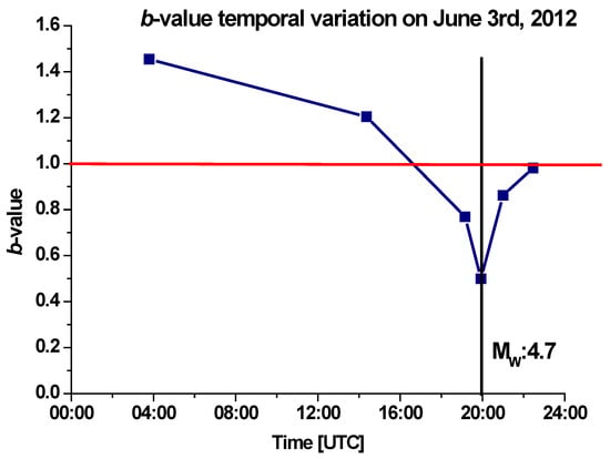 b-value variation determined for 3 June 2012, when the largest aftershock, with Mw = 4.7, occurred. A total of 99 aftershocks were recorded that day. The
