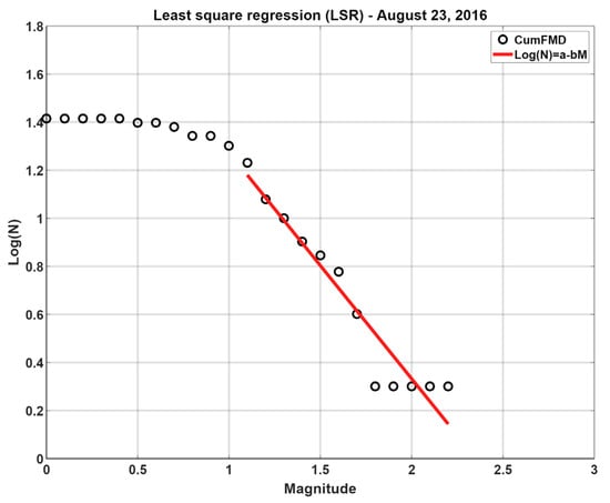 For the estimation of the uncertainty in the calculation of the b-value, the following values were calculated: 9.23% for the period from 1 August 2016 to 24 August 2016; 0.84% from 24 August 2016 to 26 October 2016; and 2.42% from 26 October 2016 to 30 November 2016.