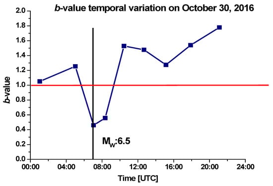 b-value during 30 October, an average value higher than 1.0 was observed. The latter decreases to 0.46 at 07:03 UTC before the occurrence of the 6.5 Mw earthquake (see