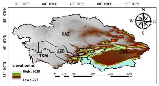 Central Asia denotes the central region of Asia; however, there is no consensus on the geographical units that comprise this region []. In our study, we follow the definition of Central Asia given in a study conducted by Deng et al. [], in which it was proposed that Central Asia comprises Kazakhstan, Turkmenistan, Uzbekistan, Kyrgyzstan, Tajikistan, and China’s Xinjiang Uygur Autonomous Region (Figure 1) []. Central Asia has a temperate continental climate. The altitude of this region is higher in the east and lower in the west, and the decrease in altitude from east to west is gradual. The climate changes from semi-arid to arid from north to south. Evapotranspiration is strong, and temperatures are low in the winter and high in the summer; there is a large temperature difference between day and night, and sunshine is abundant []. These conditions are suitable for the growth of crops. The northern portion of Central Asia mainly comprises rain-fed agricultural land, and irrigated areas are abundant in southern Central Asia []. Because the altitude in this region is high in the southeast and low in the northwest, the rivers flow from southeast to northwest. The growing period spans from April to October and can be divided into three seasons: spring (April and May), summer (June and August), and autumn (September and October) [].