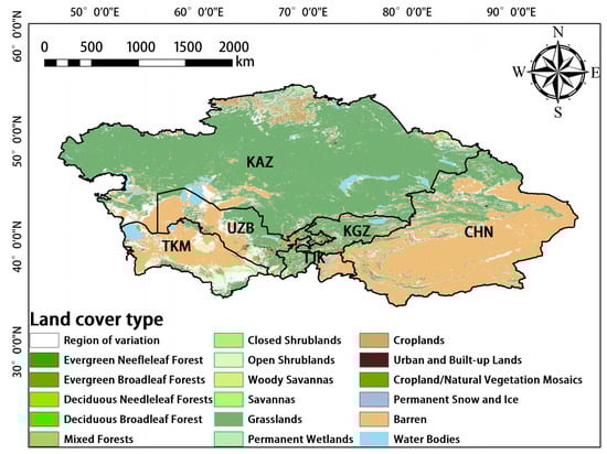 MODIS data [] were downloaded from the National Aeronautics and Space Administration (NASA) website (https://modis.gsfc.nasa.gov/ (accessed on 22 August 2022)). The MODIS sensors deployed on the NASA Terra and Aqua satellites cross the equator at 10:30 and 13:30, respectively; these satellites were launched as a part of NASA’s Earth Observation System (EOS) mission []. The MODIS sensors receive electromagnetic radiation in 36 narrow bands across a wide range of the electromagnetic spectrum, and these data are updated frequently. GPP (MOD17A2H), ET (MOD16A2), LAI (MOD15A2H), and land-cover-type (MCD12Q1) data acquired via MODIS were used in our study. The temporal resolution of MCD12Q1 was one year, whereas that of the other data was 8 d; the spatial resolution of the data was 500 m. Several studies have shown that these data are reliable and accurate [,,]. To minimize large errors in the classification process and the effects of changes in land cover, only stable pixels from 2001 to 2020 were used (i.e., areas in which there was no change in the dominant land-cover-type from 2001 to 2020) []. The Global Vegetation Classification scheme of the International Geosphere–Biosphere Project, which is a landcover dataset containing 17 land cover classes, including eleven natural vegetation classes, three developed and inland land classes, and three non-vegetation classes, was used in our study []. The main land cover types in Central Asia are grassland, desert, scrub, farmland, and woodland (Figure 2). Because ET data were lacking for bare land, no analyses were conducted on the image metadata from bare land, water bodies, and areas with unstable pixels. The above image metadata were removed using Arcgis10.8 software.