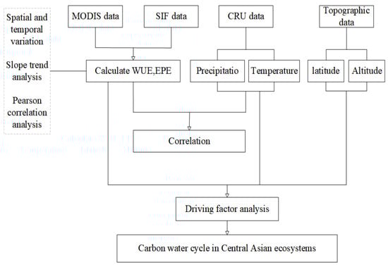 Remote-sensing technology has been used to characterize changes in the ecosystem carbon–water cycle, as well as the factors driving these changes, at global and regional scales, and several valuable insights have been provided by the corresponding studies [,]. Central Asia is one of the world’s largest arid regions at the mid-latitudes []. The ecosystem of Central Asia is fragile, and this region currently faces several major ecological problems [,,]. The carbon cycle and energy in the relationship between the atmosphere and land in this region are affected by changes in the natural environment, so these cycles exhibit unique spatial and temporal characteristics []. Research shows that a decrease in precipitation and a rise in temperature can lead to severe droughts in Central Asia, and these changes may affect vegetation growth and the ecosystem in Central Asia []. In this study, using MODIS satellite data and the GOSIF dataset developed and processed by Li et al. [], the values of WUE and EPE in Central Asia during 2001–2020 were calculated, and the spatial and temporal variation characteristics were analyzed. We also analyzed correlations of climate factors with WUE and EPE in this region over the study period. The main aims of our study were to (1) clarify spatial and temporal patterns in WUE and EPE and the relationship between changes in WUE and EPE; (2) characterize changes in the WUE and EPE of different vegetation types with respect to altitude and latitude; and (3) determine the effects of precipitation and temperature on WUE and EPE. Analyses of changes in WUE and EPE at different spatial and temporal scales in arid ecosystems could provide insights that would aid the monitoring of the carbon–water cycle and vegetation in terrestrial ecosystems. Such studies also provide important information for carbon and water balance predictions that could aid in the sustainable management of water resources in areas with fragile ecosystems. Lastly, such studies can enhance the ac-curacy of predictions of the direction of future climate change, and this affordance has key implications for the sustainable development of human society.