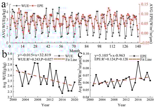 Temporal variation in WUE and EPE. (a) Monthly mean variation in WUE and EPE (b) and (c) annual mean variation in WUE and EPE.