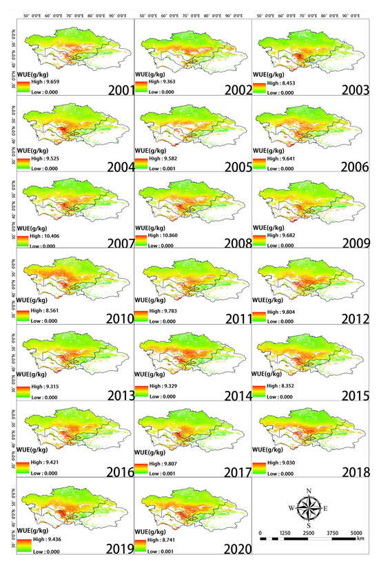 Spatial distribution of WUE during each year of the study period.