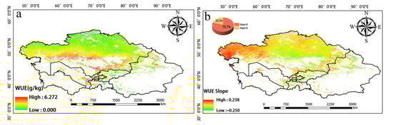 The greatest changes in inter-annual WUE in Central Asia from 2001 to 2020 were observed in the central, western, and southern regions. WUE increased in the western and southern portions of Southern Kazakhstan as well as in the vicinity of Balkhash Lake; WUE slightly decreased around the Taklimakan Desert in the southern part of Xinjiang, China (Figure 5). High WUE was mainly observed in western Tajikistan, eastern Kyrgyzstan, and Southern Kazakhstan, as well as in the Yili, Tacheng, Bortala, and Changji regions of Xinjiang, China. WUE was low in northern Kazakhstan, northern Xinjiang, and Kyrgyzstan (Figure 6a). Changes in WUE over the past 20 years were determined by calculating the slope (Figure 6b). Pixels with a slope less than 0 accounted for 79.7% of the total number of pixels. Pixels with a slope greater than 0 accounted for 20.3% of the total number of pixels. Thus, there was an overall decrease in WUE over this 20-year period.