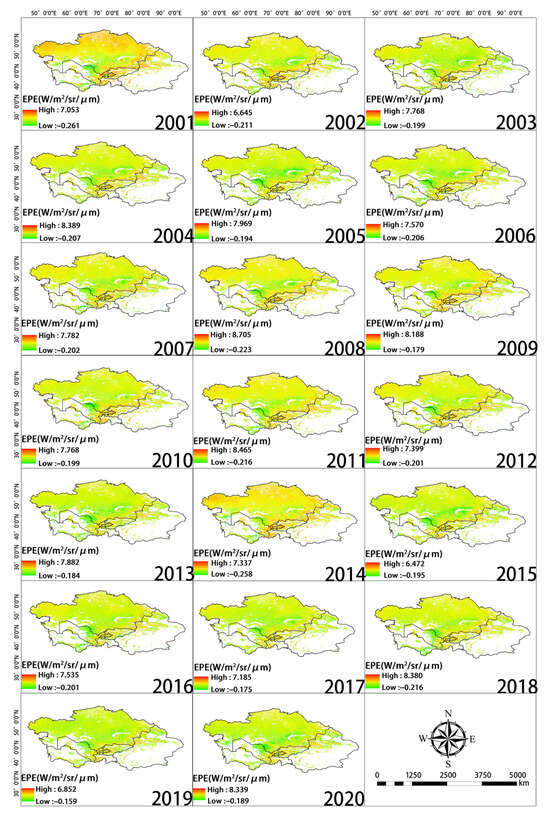 Spatial distribution of EPE during each year of the study period.