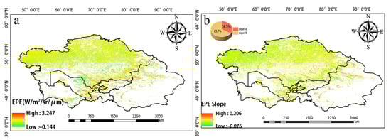 (a) Spatial distribution of annual mean EPE from 2001 to 2020. (b) Slope of EPE.
