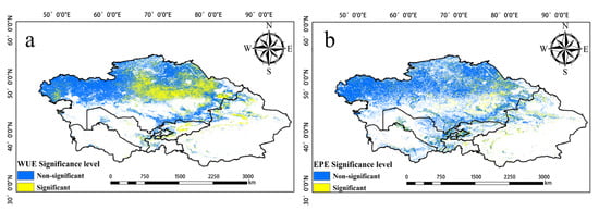 Significant changes in EPE from 2001 to 2020 were observed in the northern, eastern, and southern regions of Central Asia (Figure 7). Over the study period, the EPE in Tajikistan and Uzbekistan increased, and the EPE in Southern Kazakhstan and around Balkhash Lake decreased. High EPE was mainly observed in eastern Uzbekistan, western Tajikistan, Southern Kazakhstan, northern Kyrgyzstan, and the Ili region of Xinjiang, China (Figure 8a). EPE was high in Kyrgyzstan and northern Xinjiang, China, and this was not consistent with the WUE values in these same areas. Changes in EPE over the past 20 years were determined by calculating the slope (Figure 8b). The number of pixels with a slope less than 0 accounted for 34.3% of the total number of pixels. The number of pixels with a slope greater than 0 was 65.7%. Thus, there was an overall increase in EPE over the 20-year period analyzed. Figure 9 provides the level of significance of WUE and EPE.