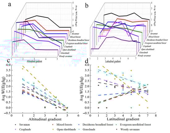 Variation in the WUE of different vegetation types with altitude and latitude. (a) Relationship between WUE and altitude. (b) Relationship between WUE and latitude. (c) Linear relationship between WUE and altitude. x axis 1: −227–1424; 2: 1424–3075; 3: 3075–4726; 4: 4756–6377; 5: 6377–8028 (m). (d) Linear relationship between WUE and latitude. x axis 1: 30.0–35.6; 2: 35.6–38.3; 3: 38.3–40.9; 4: 40.9–43.5; 5: 43.5–46.1; 6: 46.1–48.8; 7: 48.8–54.0(°). The parameters in Figure 10 are the same.