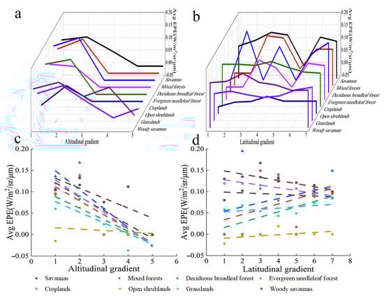 Variation in the EPE of different types of vegetation with altitude and latitude. (a) Relationship between EPE and altitude. (b) Relationship between EPE and latitude. (c) Linear relationship between EPE and altitude. (d) Linear relationship between EPE and latitude.