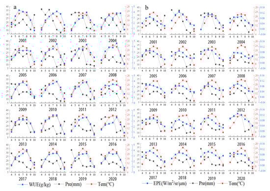 (a) Monthly mean temperature, precipitation, and WUE in each year from 2001 to 2020. (b) Monthly mean temperature, precipitation, and EPE in each year from 2001 to 2020.