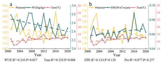(a) Annual mean temperature, precipitation amount, and WUE from 2001 to 2020. (b) Annual mean temperature, precipitation amount, and EPE from 2001 to 2020.