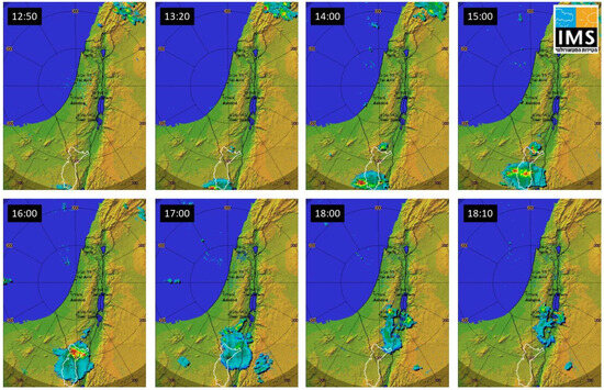 The IMS radar on 15 September 2015. The Paran watershed is outlined in white. At 12:50 UTC, a rain cloud was detected for the first time over the southwestern Paran watershed. The last cloud was detected over the northeastern corner of the watershed at 18:00.