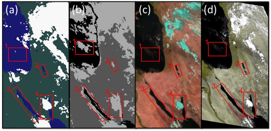 Comparison of (a) TFACLM and (b) EumetsatCLM products on 15 September 2015 at 11:15 UTC with (c) MSG RGB Day Natural Colors, and (d) MODIS-Aqua natural colors with 250 m resolution as a ground truth. The red boxes are plotted to assist in comparing the two cloud masks’ performance (for details, see text in the paragraph above).