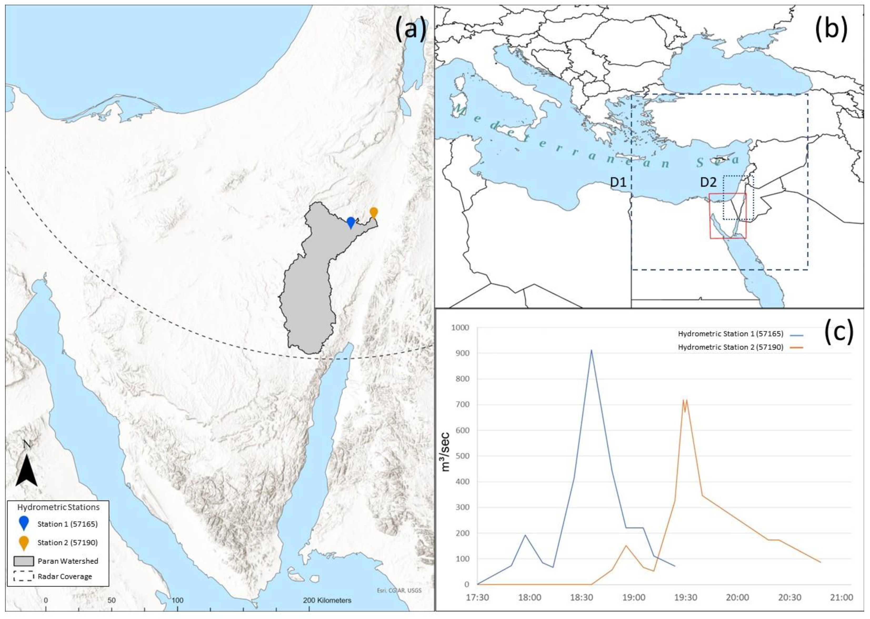 - Rinat, Y.; Marra, F.; Armon, M.; Metzger, A.; Levi, Y.; Khain, P.; Vadislavsky, E.; Rosensaft, M.; Morin, E. Hydrometeorological Analysis and Forecasting of a 3d Flash-Flood-Triggering Desert Rainstorm. Nat. Hazards Earth Syst. Sci. 2021, 21, 917–939. [Google Scholar] [CrossRef]
