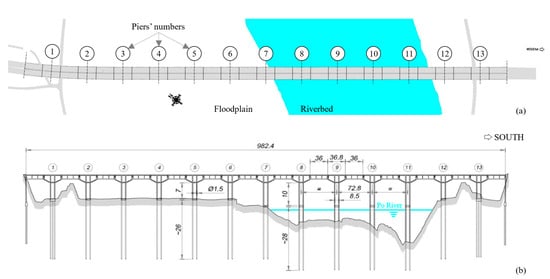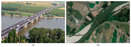 (a) Picture of the A22 Po River Bridge, Italy; (b) Top view of the case-study area.