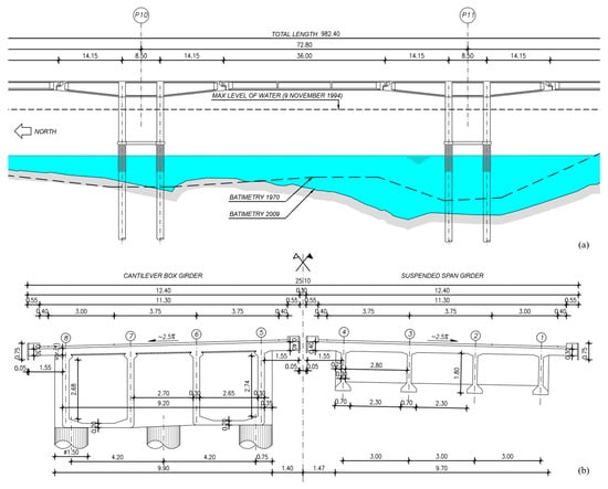 (a) Longitudinal section of Piers 10 and 11 and (b) cross sections of the A22 Po River Bridge. Dimensions in meters.