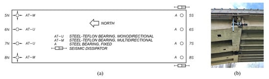 The suspended spans lean on monodirectional and multidirectional steel-Teflon bearings in the north direction and fixed steel bearings in the south direction. Seismic dissipators connect the suspended spans to the cantilevers at the shear keys with fixed bearings. Figure 4 shows a scheme of the suspended span bearings and a picture of the seismic dissipators.