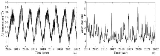 Time series from 1 May 2014 to 12 May 2021 of (a) temperature variation in the case study area and (b) water flow level of the Po River.
