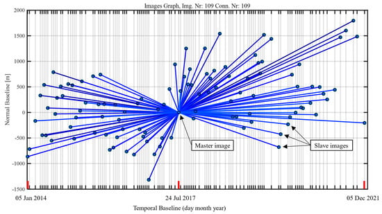 After the coregistration of all 109 SAR images and the preliminary analysis aimed at deriving the dataset’s main statistics, we performed the actual MT-InSAR processing. The following are the main steps involved in our MT-InSAR workflow and the main choices we made during the analysis of our dataset: