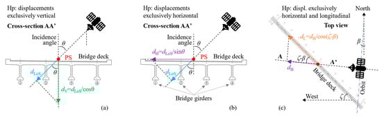 (a) Projection of displacements along the LoS (dLoS) onto the vertical direction (dV) assuming exclusively vertical displacements of the bridge; (b) projection of dLoS onto the horizontal component of the LoS (dH) assuming exclusively horizontal displacements of the bridge; (c) projection of dH onto the longitudinal direction of the bridge (dL) assuming exclusively horizontal longitudinal displacements of the bridge.