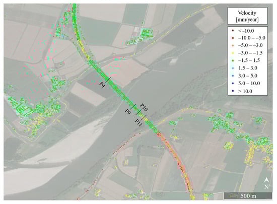The PSs are mainly concentrated along the highway, within urban centres, and along local roads. As expected, the PSs are absent along the river and cultivated fields, except for four aligned PSs in the upper left corner, corresponding to high-voltage power line towers. Most PSs are coloured in green, indicating nearly negligible deformation velocity ranging between −1.5 and +1.5 mm/year. The road accessing the bridge from the south exhibits red and orange PSs, as does the road adjacent to the southern embankment of the river. The bridge is primarily covered by green PSs, with a small yellow portion—meaning deformation velocity between −3 and −1.5 mm/year—near Piers 10 and 11. These results suggest that the bridge experiences nearly negligible deformation velocity throughout its span, except for the portion that underwent significant erosion at the base of the piers and was retrofitted with backfill soil in 2012, as indicated by the yellow colour of PSs. This result may suggest the resumption of erosion phenomena at the base of the piers, which may have eroded the backfill soil after 2012.