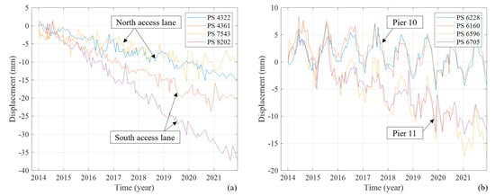 Displacement time series of PSs located on (a) the access lane to the north (PS 4322, PS 4361) and south (PS 77542, PS 8202) of the bridge; (b) the top of Pier 10 (PS 6228, PS 6160) and Pier 11 (PS 6596, PS 6705).