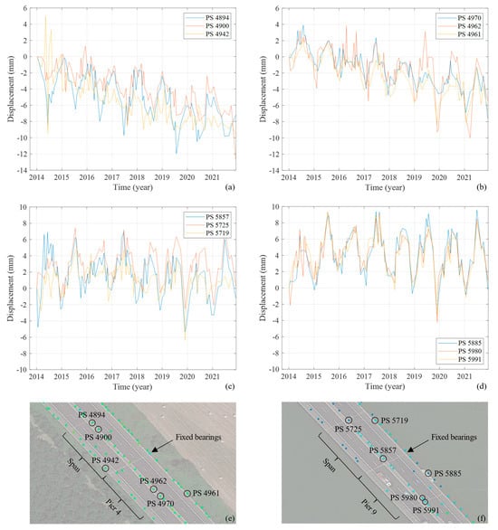 Displacements of (a) the north cantilever and (b) the south cantilever of Pier 4 in the floodplain; displacements of (c) the north cantilever and (d) the south cantilever of Pier 9 in the riverbed; (e) location of PSs on Pier 4, and (f) location of PSs on Pier 9.