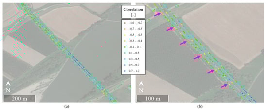 Figure 18a illustrates the map of the identified PS on the bridge, represented in a colour scale corresponding to the Pearson correlation coefficient resulting from comparing displacements and water level for each PS. Figure 18b shows a zoom on the riverbed portion of the bridge.