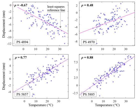 Scatterplots of the variables Displacements (dLoS) and Temperature with the least-squares reference line (magenta line) and correlation coefficient (ρ) for PS 4894, PS 4970, PS 5857, PS 5885.