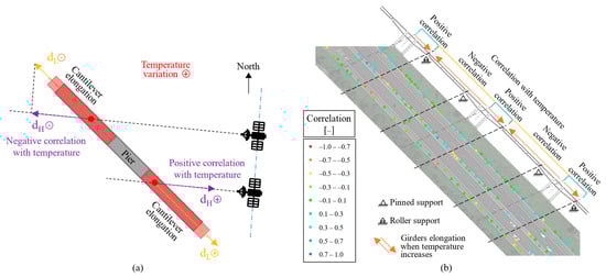 (a) Scheme explaining the negative and positive sign of the horizontal longitudinal displacements of the cantilevers obtained from satellite measurements as temperature increases; (b) application to the A22 Po River Bridge, highlighting the portions with a positive and a negative correlation between displacements time series and temperature variation.