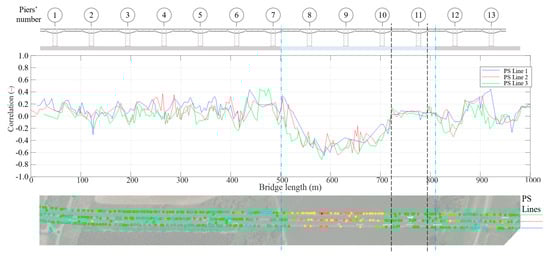 This periodic variation of the linear correlation along the bridge is clearly visible in Figure 16, where this parameter is reported for the three lines of PSs highlighted in the figure plotted against the length of the bridge. Figure 16 also shows the longitudinal section of the bridge on the same scale as the PS map and the graph. Marking the negative peaks of the correlation (see the black dashed lines in Figure 16), we can notice that they correspond to the right (northern) joint of the suspended span—the one with monodirectional and multidirectional bearing (thus, roller supports).
