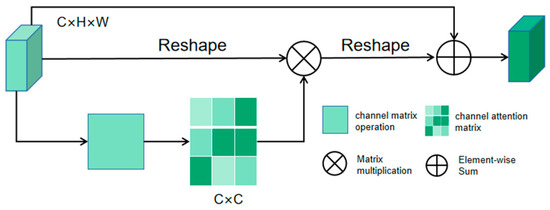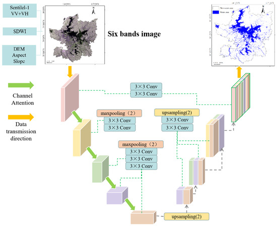 The U-Net network model, named after its U-shaped structure, is an improved end-to-end architecture based on the Fully Convolutional Network (FCN) framework [30]. This model can effectively fuse high-level semantic information and shallow features, leveraging context information and detail features to obtain more accurate feature maps [31]. However, the original U-Net model only uses three-channel imagery as the input and does not fully consider the terrain and landform characteristics within the study area. To address this limitation, we enhanced the model by modifying the image input to six channels, enabling the model to simultaneously extract radar features, water indices, and terrain characteristics. Moreover, to explore deep semantic information in the six-channel imagery, we replaced the original feature extraction network of the model with the deeper VGG16 convolutional neural network. We also incorporated a channel attention mechanism during the downsampling process of the convolutional network (Figure 3) to update the model’s attention weights for different channels and further improve the segmentation performance. Finally, to better distinguish water body boundaries, we modified the model’s loss function by introducing the Dice coefficient in addition to the Cross-Entropy Loss, creating the Dice Loss to assist the classifier and achieve better segmentation results. Based on these improvements, we obtained the enhanced U-Net, denoted as the Channel Attention U-Net (CAU-Net) semantic segmentation model for water body extraction in the Poyang Lake area. Figure 4 presents the structure of the optimized model.
