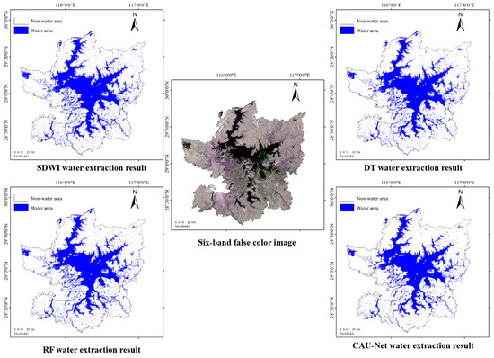 In order to provide a more intuitive demonstration of the differences between the methods, we selected several typical water extraction results within the study area for a detailed comparative analysis. Figure 7 depicts the results. The water body extraction performance is observed to vary across the methods. The extraction of the SDWI method is fast and simple, yet it is influenced by various factors such as image noise and terrain, leading to suboptimal results with a significant amount of scattered misclassified water bodies. Following the incorporation of the terrain features, the decision tree and random forest methods exhibit improvements via the reduction in misclassified water bodies. However, their extraction of water body boundaries still remains relatively coarse. In comparison, the proposed CAU-Net method effectively mitigates the impact of image noise and terrain factors, greatly minimizing the misclassification of water bodies. The second row of Figure 7 reveals the presence of noise points generated due to water surface reflection. The SDWI, decision tree, and random forest methods are heavily affected by this noise, resulting in the misclassification of water bodies in the noisy regions as non-water bodies. In contrast, CAU-Net effectively suppresses the influence of this background noise. In particular, the analysis of neighboring pixels around the noise points using convolutional neural networks greatly reduces the misclassification of water bodies.