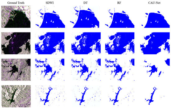 The extraction of water body information is critical to remote sensing-based flood monitoring. Optical remote sensing has evolved from simple visual interpretation to the construction of the NDWI, which can achieve relatively accurate water body extraction results, and different water body index layers can be generated under various conditions [33]. However, flood monitoring is distinct to simple water body extraction. During flood disasters, adverse weather conditions often prevail, making optical remote sensing ineffective for monitoring. Microwave remote sensing, on the other hand, with its ability to penetrate clouds and fog, has become a popular choice for flood monitoring [34]. The results of the three water body extraction methods meet the requirements for high accuracy in terms of the OA and Kappa coefficient. This demonstrates the feasibility of using SAR data for water body extraction, with CAU-Net achieving the highest accuracy.