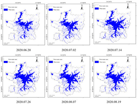The comparison of the water body extraction results using the three methods indicates that both the SDWI method and CAU-Net can achieve the desired accuracy while ensuring timeliness. Therefore, CAU-Net is chosen as the optimal water body extraction method. Based on CAU-Net, this study utilizes the deep learning model obtained earlier to predict the water body extent during the flood period from June to August 2020 using Sentinel-1B imagery captured every 12 days. Figure 8 presents the resulting maps of the water body during the six periods.