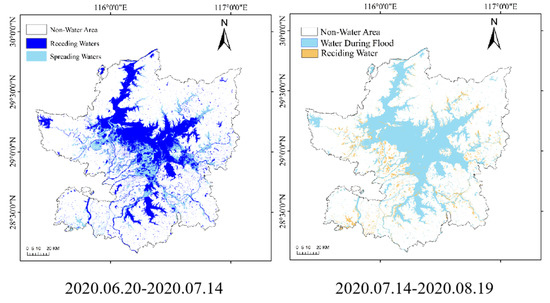 This paper took 20 June, 14 July, and 19 August as the pre-flood, mid-flood, and post-flood times, respectively. Figure 10 presents the flood inundation maps determined by overlaying the water body extents during the (i) pre-flood and mid-flood periods; and (ii) the mid-flood and post-flood periods. The maps reveal the severely affected areas of the flood disaster to be concentrated around Poyang Lake, with significant inundation occurring in Yongxiu County, Poyang County, Xinjian District, and Yugan County.