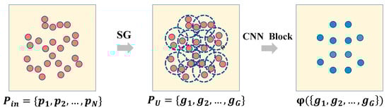 Local feature extraction was performed to each centroid group () gained after SG sampling and grouping. PU which was gained in the above text was input into the CNN Block module and convolution, BN [] batch normalization and ReLU [] nonlinear activation functional operation were performed based on multilayer perception (Mlp) as Equation (2):