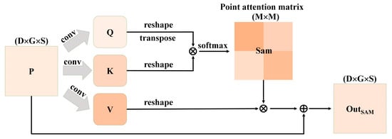 The specific operation of SAM module is shown in Figure 5. after feature extraction was used as input, which was recorded as . It was input into the convolutional layer with D output channels, getting two new feature mapping and . After reshaping of Q and K, and were acquired, where M = G × S, representing quantity of point clouds. The calculation formula of self-attention matrix (Sam) is expressed as Equation (3), where .
