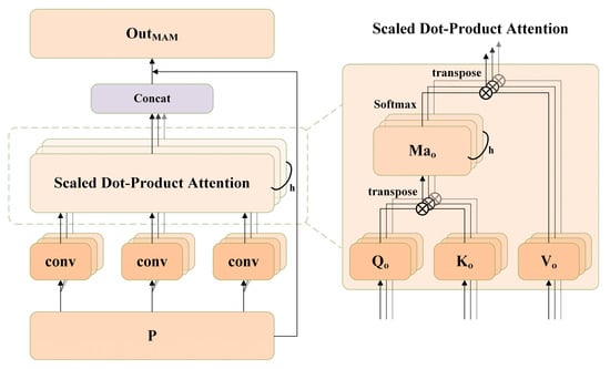 The specific process of MAM is shown in Figure 6. The input data were input into several convolutional layers with D channels and the channels were divided into h heads, getting feature mapping of different subspaces , and . Specifically, , where and . The calculation formula of feature mapping of each subspace is: