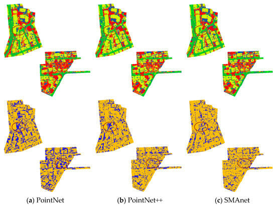 For visual interpretation of experimental results, two representative models of PointNet and PointNet++ were chosen. Results of PointNet and PointNet++ as well as the proposed SMAnet were displayed for qualitative analysis. PointNet is the pioneer of semantic segmentation of point clouds and PointNet++ is the improved version of PointNet. Based on PointNet++, this study further proposed the SMAnet model. The semantic segmentation results (upper rows) and positive-negative chart (lower rows) of three models under the test set are shown in Figure 11. By comparing the results in the ellipses in the figure, experimental results of PointNet and PointNet++ have obvious wrong classifications. In particular, they have low classification precisions in the mixing distribution regions of point clouds, such as of buildings and trees, or shrubs and trees, as shown in Figure 11a,b. The SMAnet model can inhibit such wrong classification effectively and its classification precision is improved significantly compared to those of the PointNet and PointNet++ models.