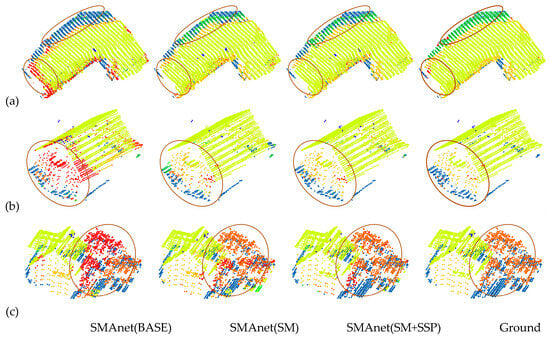 For more intuitive observation and analysis of experimental results of different strategies, three representative areas in the test set were chosen and displayed as Figure 13a–c. They are from typical regions in the test set, as shown in oval regions in Figure 10. All three areas are in the mixing region. Semantic segmentation results of SMAnet (BASE), SMAnet (SM) and SMAnet (SM+SSP) in three areas are shown in the first three columns in Figure 13. The fourth column is the ground truth provided by ISPRS 3D official website.